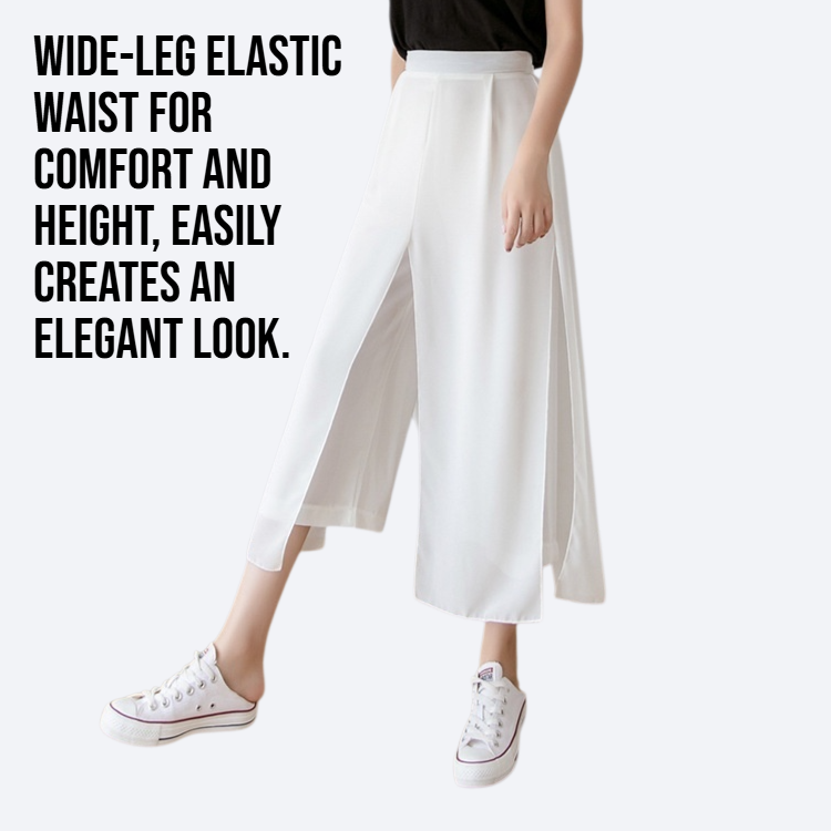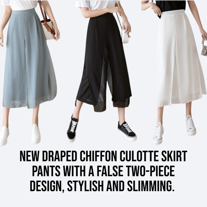 Chiffon fabric, fake two-piece design, wide leg silhouette, comfortable fit, suitable for daily wear, easy to match, lightweight, breathable, fashionable style, versatile for seasons.